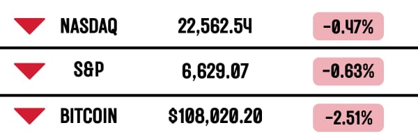 The biggest hit came from Bitcoin, tumbling 2.51% to $108,020.20 after a volatile few days in the crypto world. Investors are watching closely as tech stocks cool and traders brace for more market swings ahead.