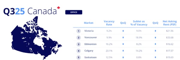 The Canadian office market continues to find its footing in Q3 2025, with vacancy levels showing signs of stabilization across most major cities, according to the latest data from Colliers.